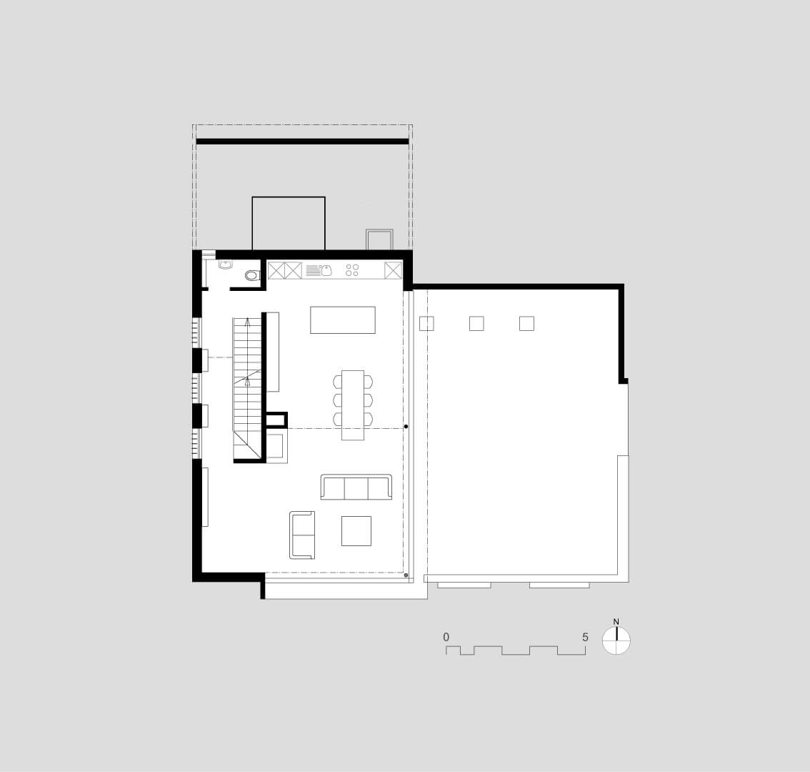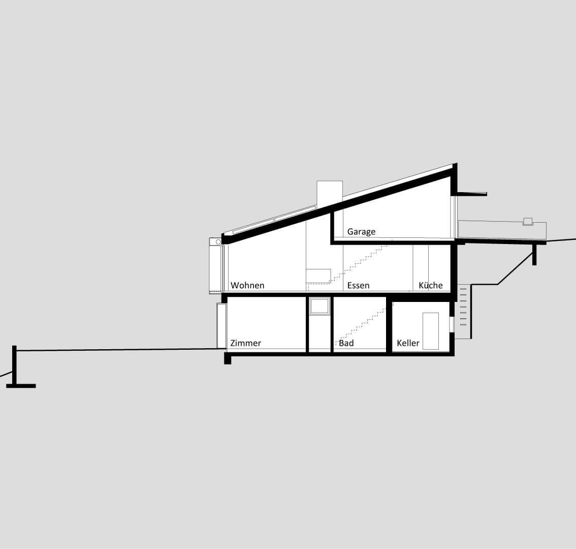Die herrliche Aussicht auf den Jura von allen Räumen aus und ein pflegeleichter Garten wurde durch die Geländeterrassierung mit Gebäude und Stützmauern erreicht. Die Holzportalen der Öffnungen zu den Schlafräumen im Sockelgeschoss zeigen den Stützmauer-Charakter. Durch die Querstellung des Wohngeschoss darüber wirkt das Volumen gegliedert die Stützmauer löst sich auf. Die raumhohen Schiebetüren im ganzen Wohnbereich ermöglichen die Aussicht und lassen die grosse Terrasse zur Wohnraumerweiterung werden.