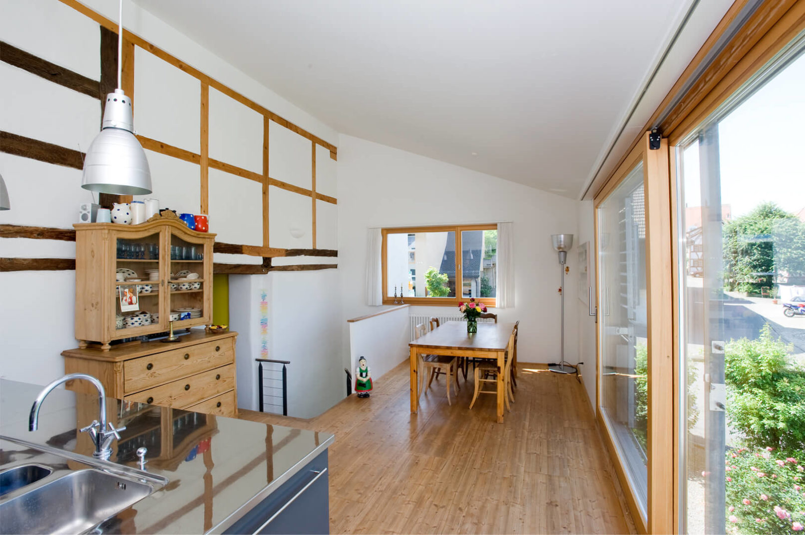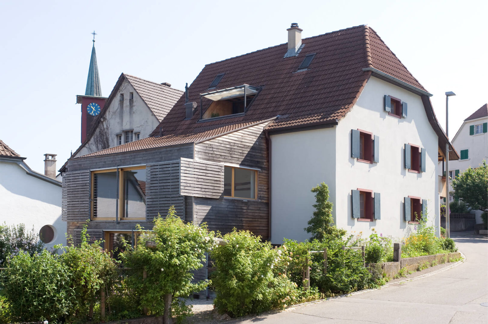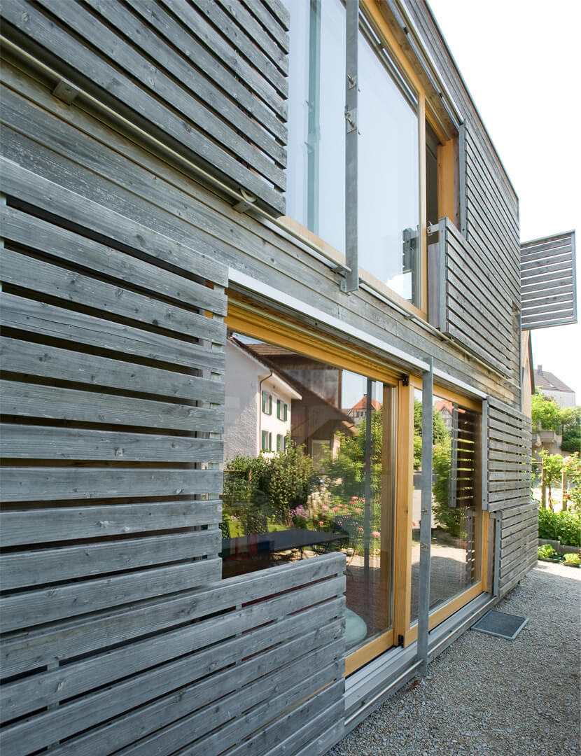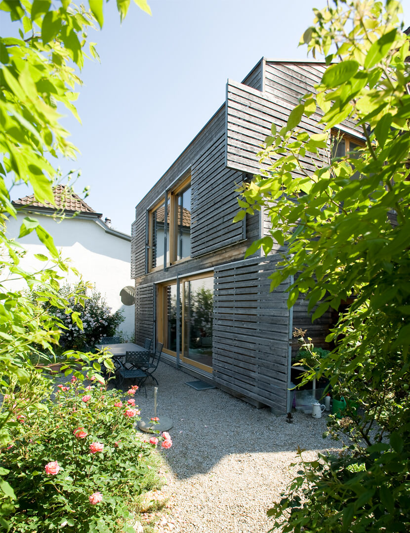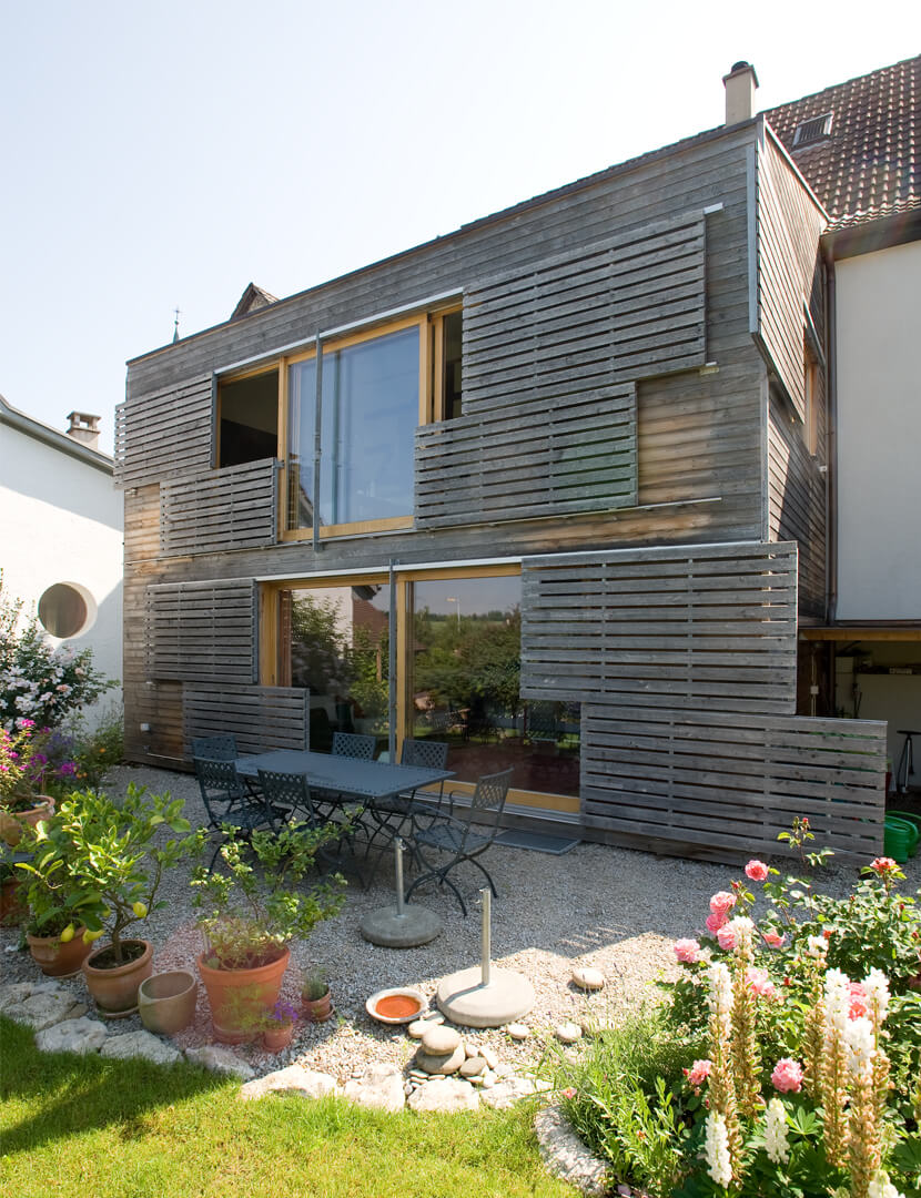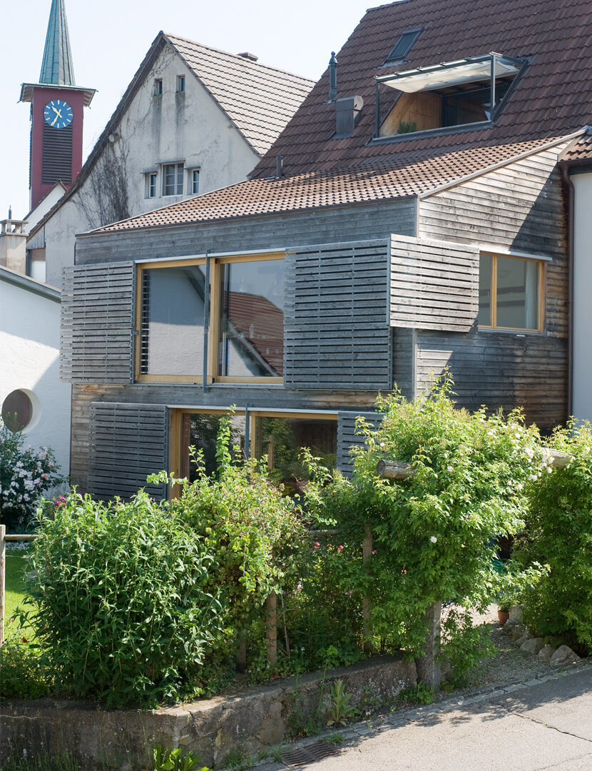 Im Ober- und Dachgeschoss wurde eine Maisonettewohnung mit Erschliessung über die bestehende Laube eingebaut. Der alte Schopfanbau wurde zugunsten des Gartens verkleinert und zu Wohnräumen für die Erdgeschosswohnung umgebaut. Während kleine Fenster, naturbelassene Holzbalken und Riegel sowie geringe Raumhöhen Merkmale des Altbaus sind, wurde der neue Anbau – eine Holzkonstruktion mit äusseren Lärchenschalungen und innerer Verkleidung aus gestrichenen OSB-Platten – mit grossen Räumen und Fenstern gestaltet. Die Läden, die über die Fassaden hinausgeschoben werden, erinnern an die ehemaligen Scheunentore. Im oberen Geschoss des Anbaus sind die Schiebeläden mit den Fenstern gekoppelt und dienen somit auch als Brüstung. Dies ermöglicht einen grosszügigen Ausblick weit nach Westen. Fotos: Mathias Leemann