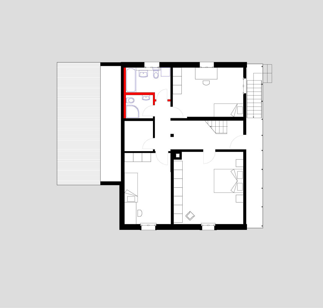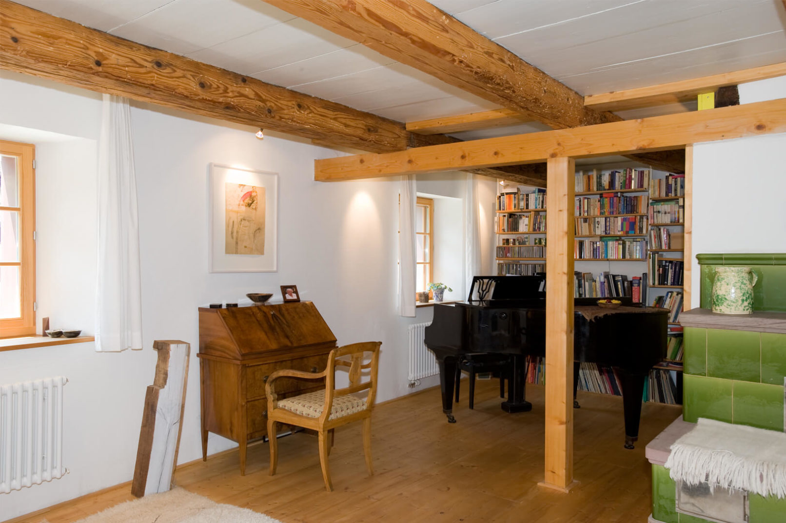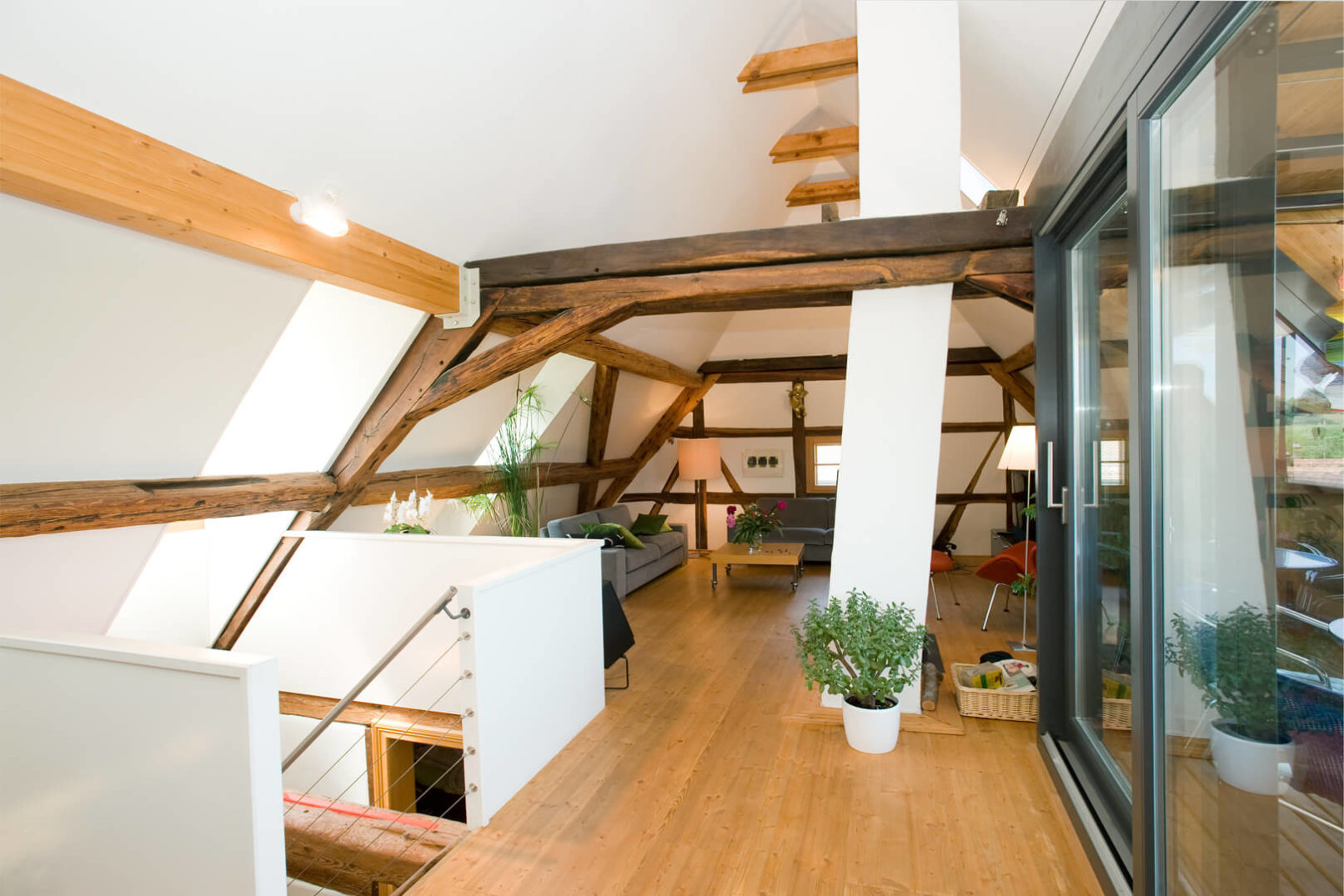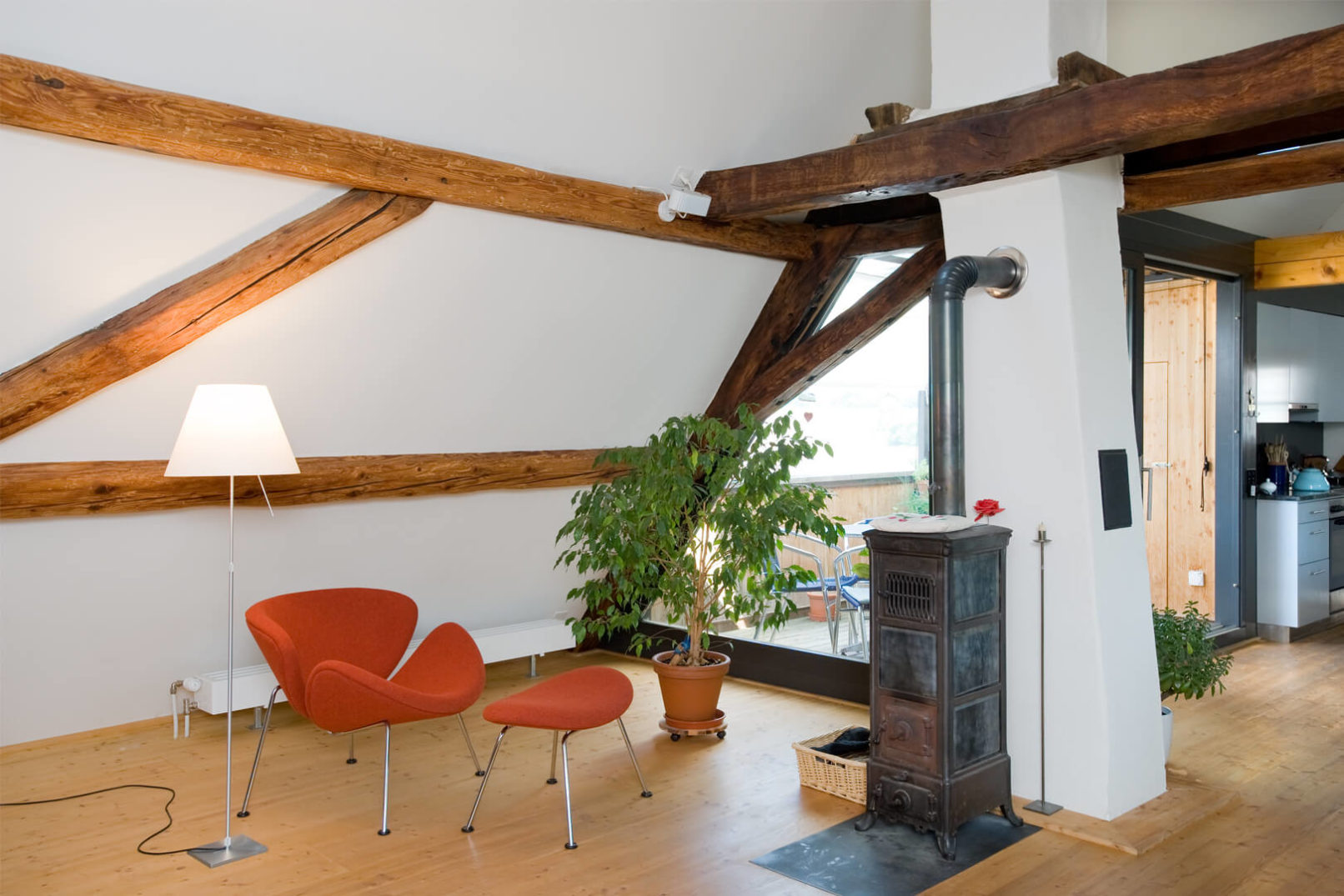 Im Ober- und Dachgeschoss wurde eine Maisonettewohnung mit Erschliessung über die bestehende Laube eingebaut. Der alte Schopfanbau wurde zugunsten des Gartens verkleinert und zu Wohnräumen für die Erdgeschosswohnung umgebaut. Während kleine Fenster, naturbelassene Holzbalken und Riegel sowie geringe Raumhöhen Merkmale des Altbaus sind, wurde der neue Anbau – eine Holzkonstruktion mit äusseren Lärchenschalungen und innerer Verkleidung aus gestrichenen OSB-Platten – mit grossen Räumen und Fenstern gestaltet. Die Läden, die über die Fassaden hinausgeschoben werden, erinnern an die ehemaligen Scheunentore. Im oberen Geschoss des Anbaus sind die Schiebeläden mit den Fenstern gekoppelt und dienen somit auch als Brüstung. Dies ermöglicht einen grosszügigen Ausblick weit nach Westen. Fotos: Mathias Leemann