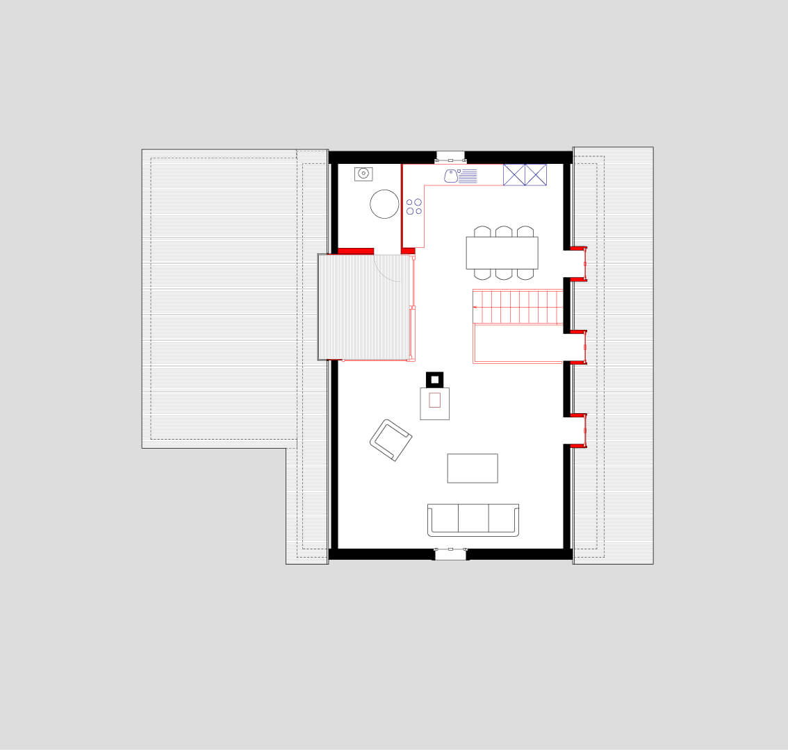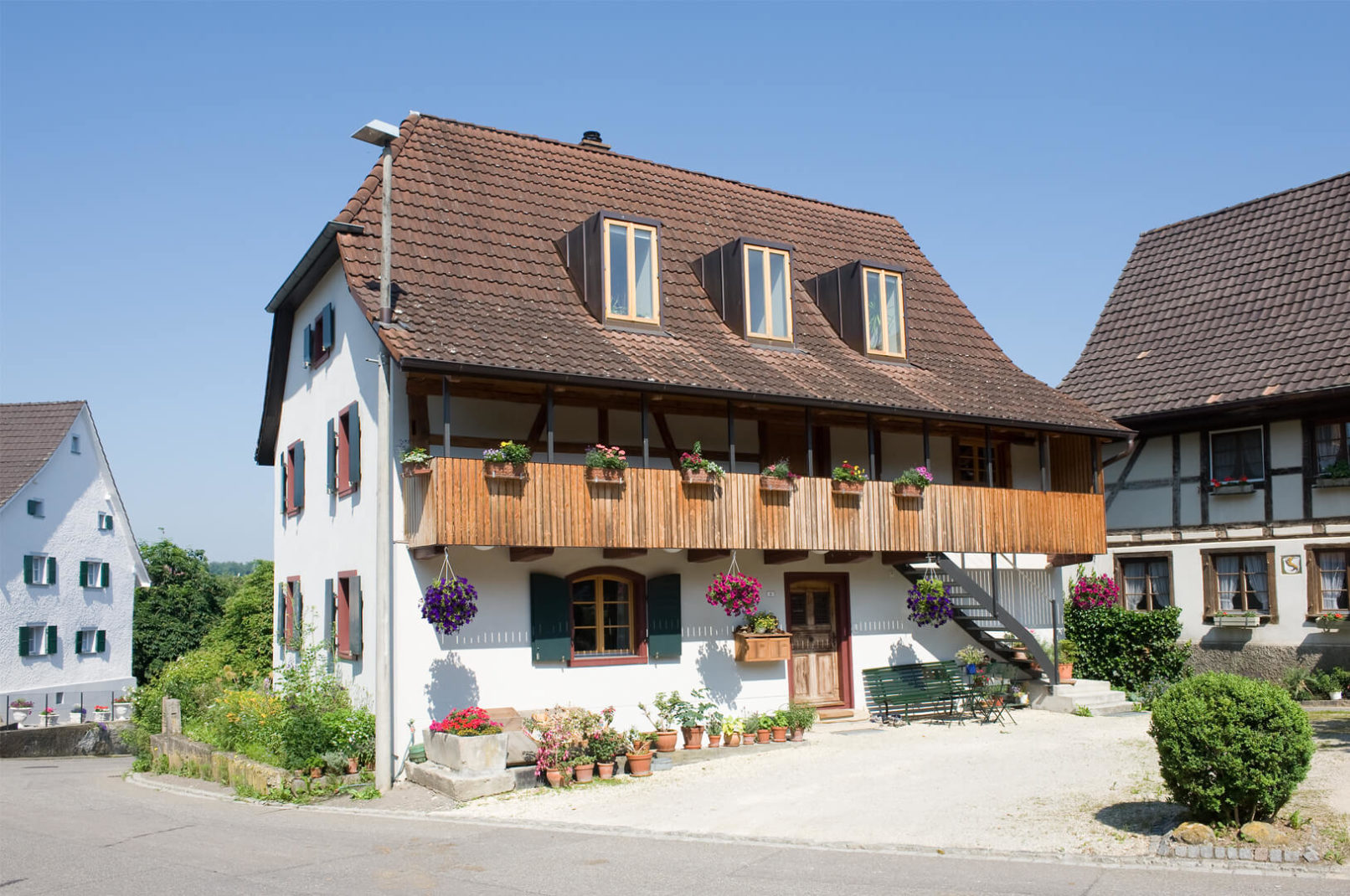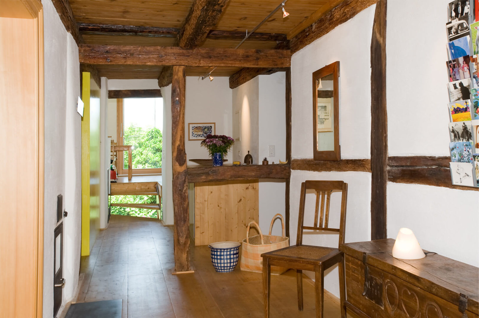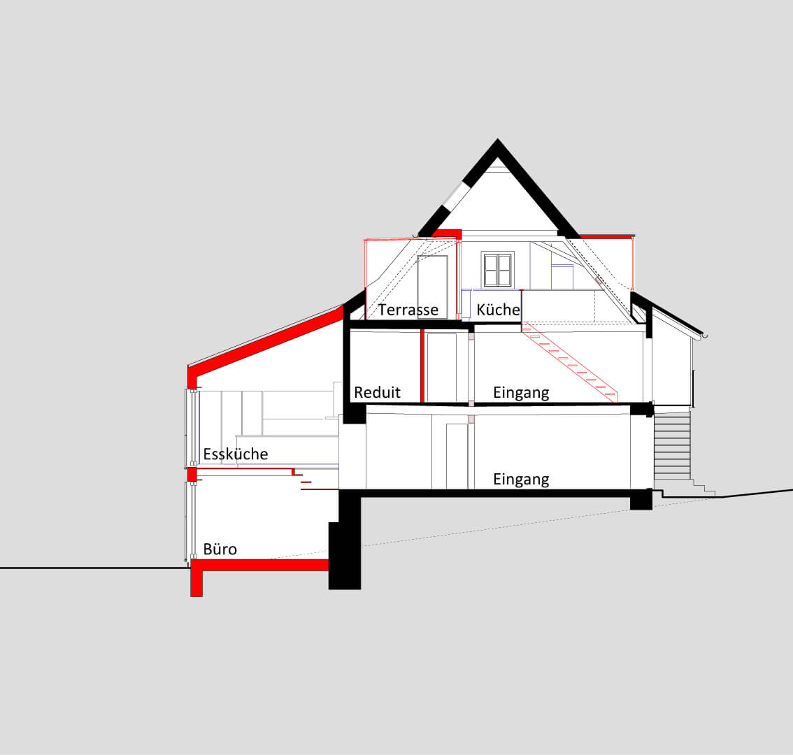 Das Bauernhaus aus dem 17. Jahrhundert liegt im Dorfkern von Schönenbuch an der Grenze zu Frankreich und diente vor der Sanierung Asylbewerbern als Wohnhaus. Der sehr schlechte Zustand bedingte eine komplette Sanierung: Teile der Decken- und Riegelkonstruktion musste ersetzt werden, neue Nasszellen wurden eingebaut, die einzelnen Holzöfen durch eine zentrale Gasheizung ersetzt und die bestehende Fassadendämmung ergänzt. Dieser grundlegende Eingriff ermöglichte – ohne Veränderung der alten Raumstruktur – die Aufteilung des Hauses in 2 Wohneinheiten.